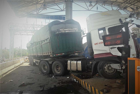 Xe đầu kéo sau khi tông đuôi xe khách đang lưu thông cùng chiều tiếp tục lao thẳng vào trạm thu phí BOT Liên Đầm, tông gãy gác chắn và sập phòng soát vé.