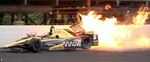 Với tốc độ 230 km/h, James Hinchcliffe đã gặp tai nạn nghiêm trọng khi chiếc xe của anh mất lái và đâm thẳng vào tường tại giải đua Indy 500 diễn ra hôm thứ 2 (18/5).