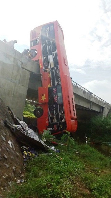 Sau khi xảy ra tai nạn, chiếc xe khách treo lơ lửng trên thành cầu, đầu cắm xuống đất. Vụ tai nạn làm 1 người chết và 10 người bị thương.