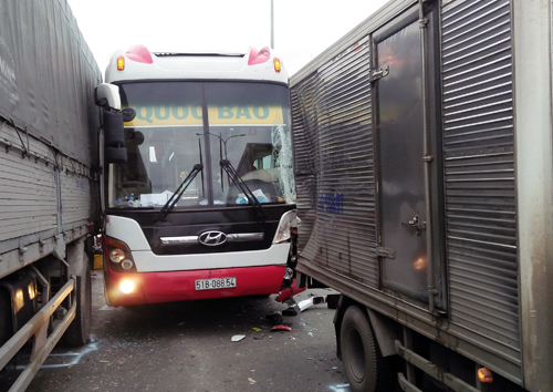 Đoạn gần qua cầu vượt Gò Mây (cách 500m) thuộc phường Bình Hưng Hòa, quận Bình Tân) xe khách bất ngờ va chạm với 1 ô tô 4 chỗ cùng 2 xe tải chạy cùng chiều.