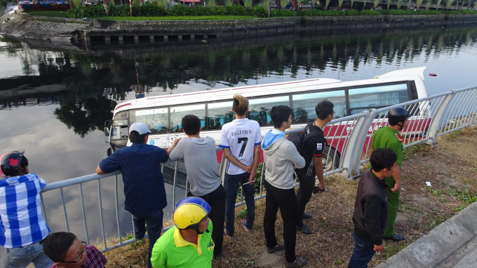 Nên đọcTại hiện trường, chiếc xe cắm phần đầu xuống nước, tài xế và phụ xe mở cửa thoát ra ngoài. Lúc sự cố xảy ra trên xe không có khách nên không có thương vong.