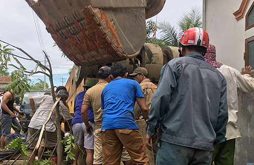 Người dân hợp sức giải cứu nạn nhân bị xe lu đè. |