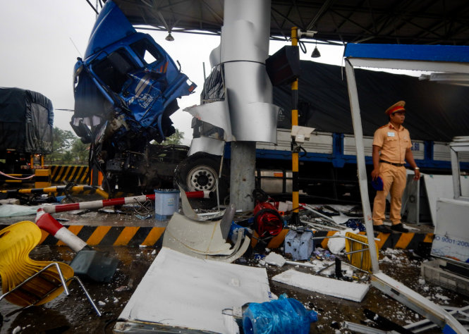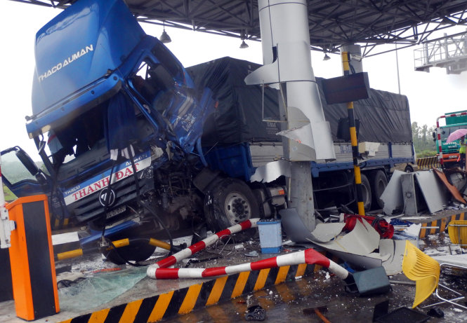 Đầu xe tải nát bươm, các mảnh vỡ từ phòng thu phí văng tứ tung. Ảnh: Tuổi trẻ |