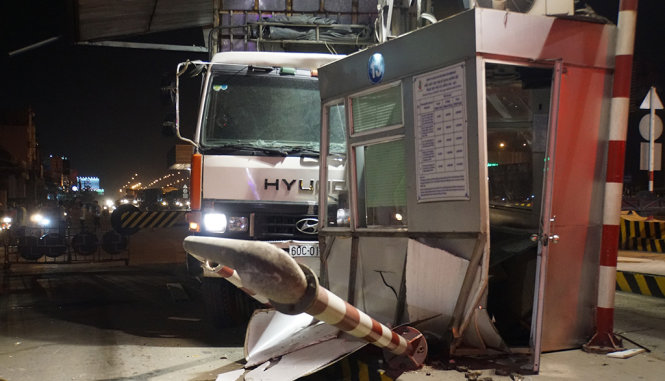 Hiện trường vụ xe tải tông vào tram thu phí cầu Đồng Nai. Ảnh: Tuổi Trẻ |