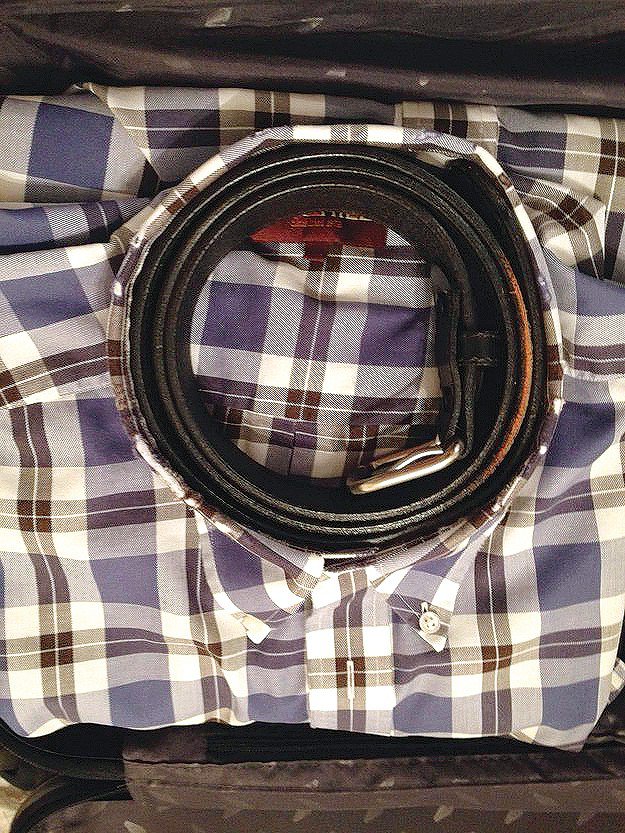 Nghe có vẻ sai sai nhưng thực tế chiêu này lại rất tiện dụng trong các chuyến đi bắt buộc có áo sơ mi chỉnh tề của bạn. Hãy cuộn tròn thắt lưng da lại và để vào trong cổ áo sơ mi (nhớ là bạn hãy gập áo sơ mi gọn gang nhé). Như vậy cổ áo sơ mi sẽ giữ được form dù bạn có di chuyển nhiều lần đến đâu. Thêm vào đó, bạn còn tiết kiệm được chỗ xếp đồ.