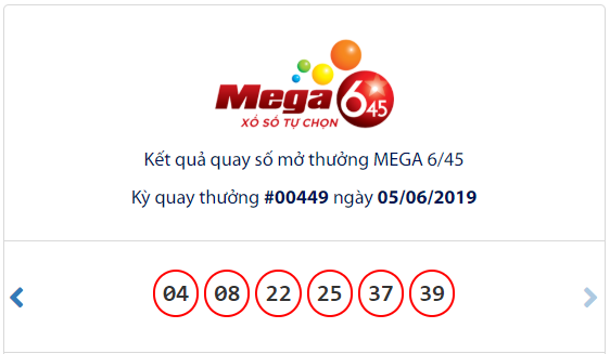 Tối ngày 5/6, Vietlott tổ chức chương trình quay số mở thưởng loại hình xổ số Mega 6/45 lần thứ 449 với tổng giải thưởng Jackpot trị giá 31.263.883.000 đồng.
