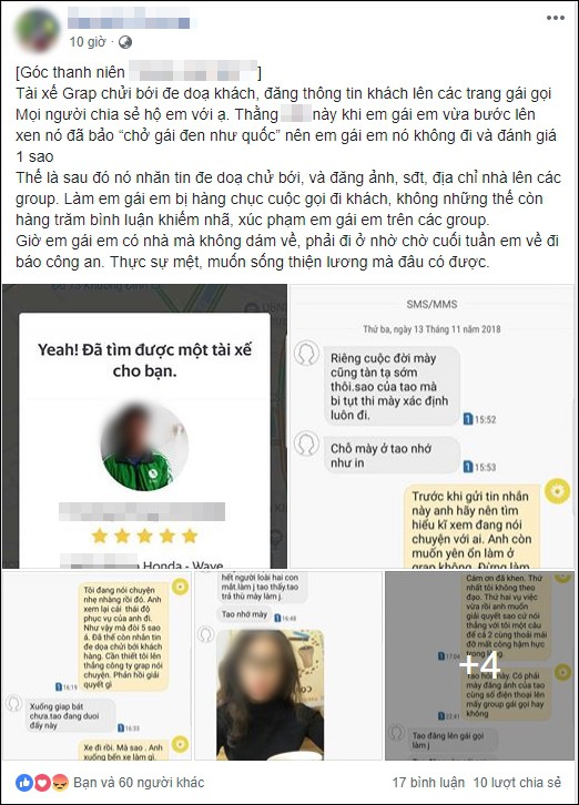 "Tài xế Grab chửi bới, đe doạ khách, đăng thông tin khách lên các trang gái gọi. Thằng này khi em gái em vừa bước lên xe nó đã bảo "chở gái đen như cuốc" nên em gái em nó không đi và đánh giá 1 sao. Thế là sau đó nó nhắn tin đe doạ chử bới và đăng ảnh, sđt, địa chỉ nhà lên các group làm em gái em bị hàng chục cuộc gọi đi khách, không những thế còn hàng trăm bình luận khiếm nhã, xúc phạm em gái em trên các group" - chị N.P bức xúc viết trên Facebook.