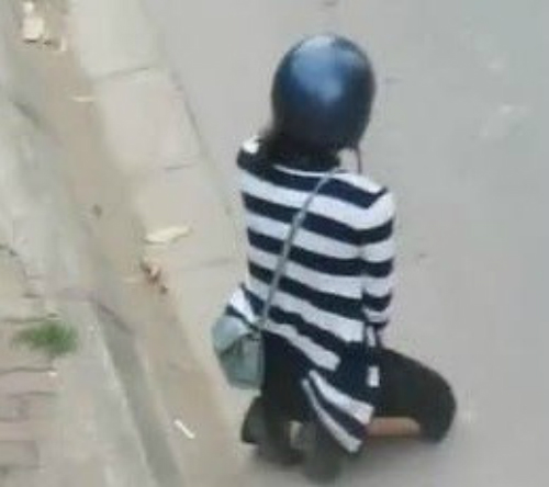 | Cô gái quỳ gối bên đường. Ảnh cắt từ clip |