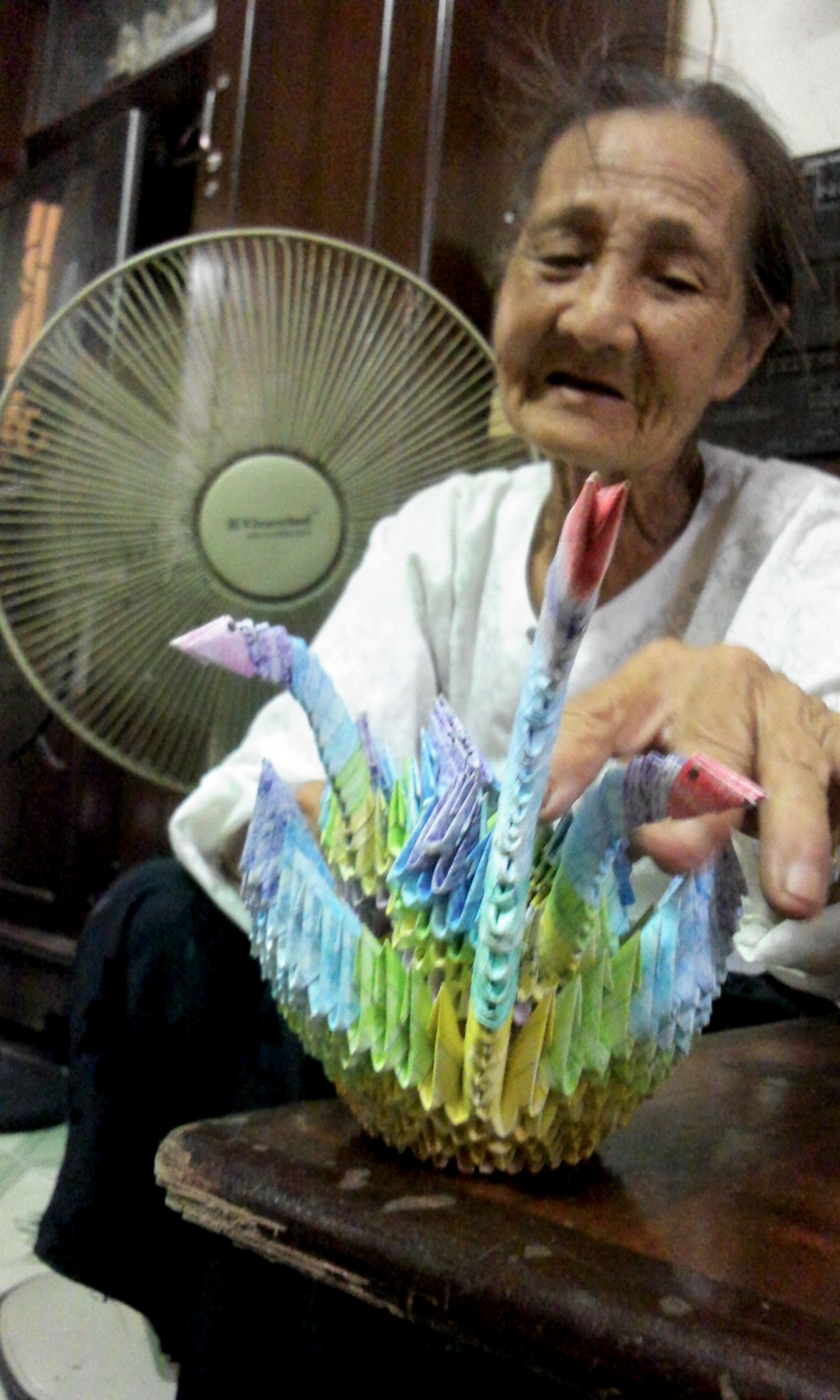 | Những con hạc được Nhi gấp tỉ mỉ bằng giấy khi nằm ở nhà. |