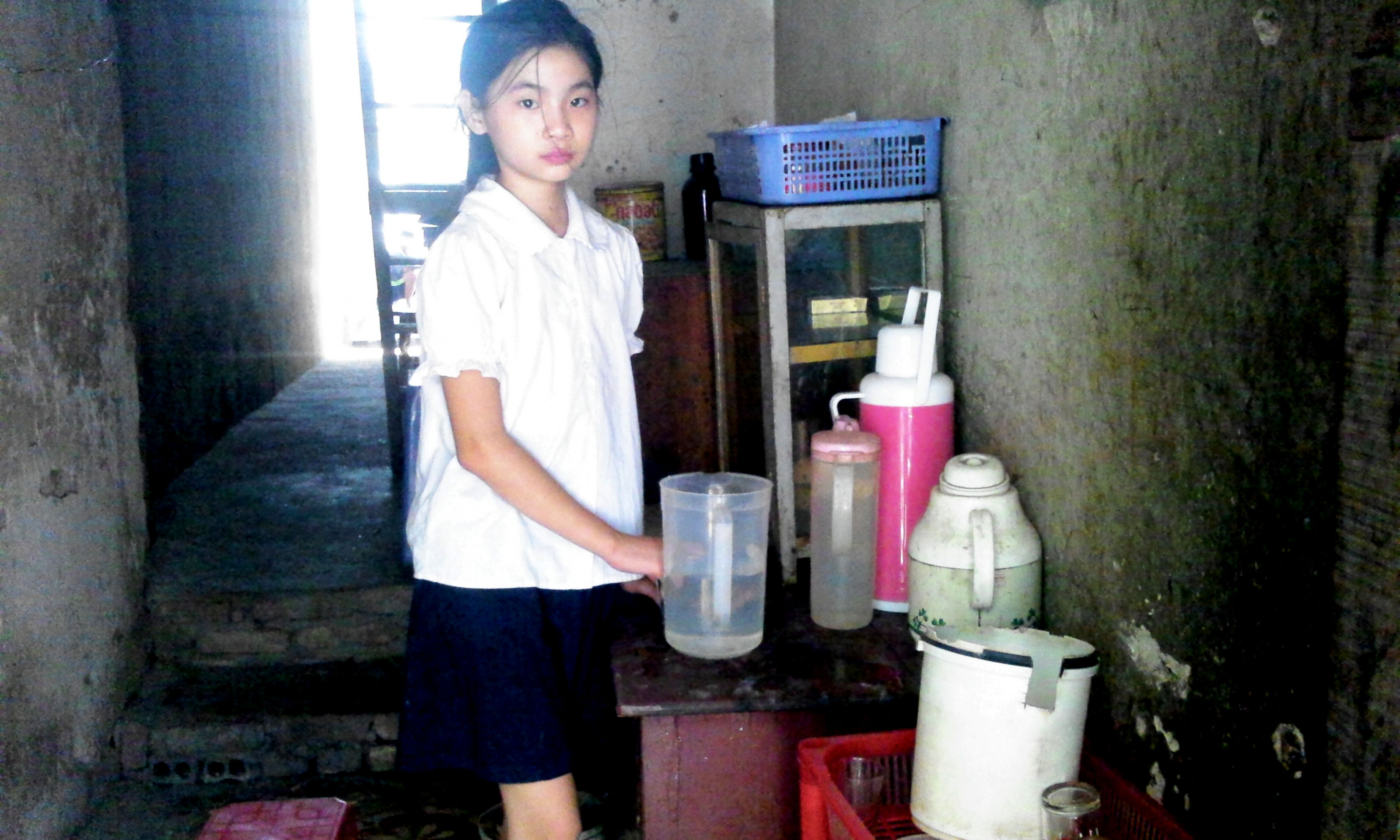 | Nguyễn Quỳnh Anh (11 tuổi) bên cạnh quán nước của bà mình. |