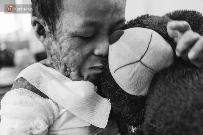 Tức tốc chạy sang, chị Ngọc đau đớn chứng kiến cảnh đứa con bị lửa thiêu khắp cơ thể, da lột gần hết từ đầu đến tận chân. "Khi lấy lại được bình tĩnh, tôi liền lấy cái khăn to cuộn cháu vào đưa đi sơ cứu ở bệnh viện huyện. Nhưng do vết bỏng quá nặng, cháu được chuyển gấp lên tuyến trên. Lúc ấy tôi cũng không còn nước mắt mà gào khóc, phải cứu con trước cái đã", chị Ngọc nhớ lại.