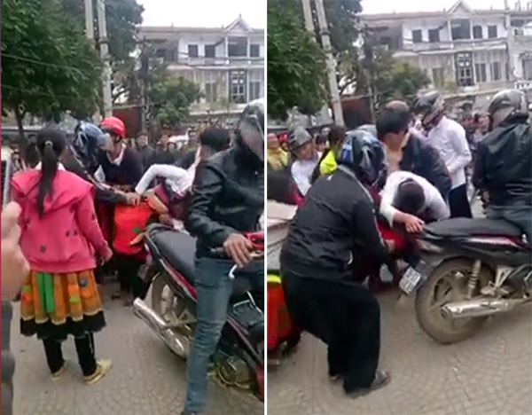 Cô gái trẻ bị nhóm thanh niên đưa lên xe máy để "bắt về làm vợ". Ảnh: Công an nhân dân |