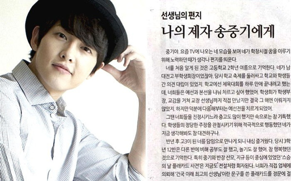 Mới đây, bức thư cũ của thầy giáo cấp ba viết cho Song Joong Ki đang được lan truyền một cách nhanh chóng trong Cộng đồng mạng. Bức thư có tiêu đề "Gửi học trò của tôi Song Joong Ki" được viết vào năm 2010.
