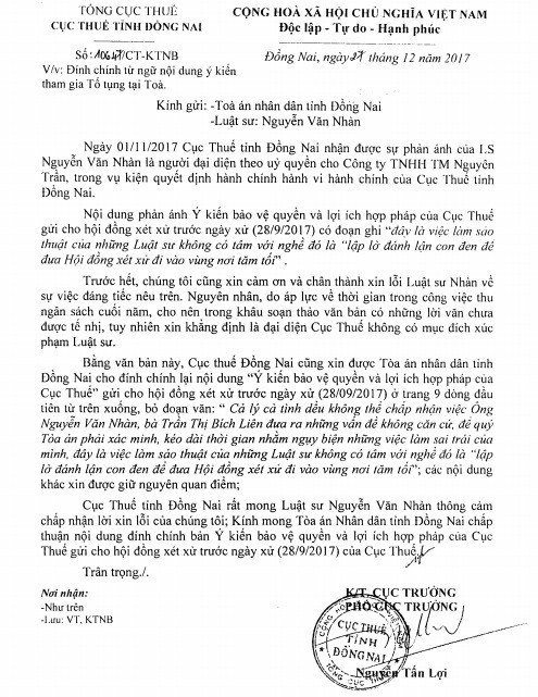Cũng được thể hiện trong văn bản, Cục Thuế tỉnh Đồng Nai xin được đính chính những nội dung chua tế nhị bị khiếu nại và giữ nguyên quan điểm với các nội dung khác.