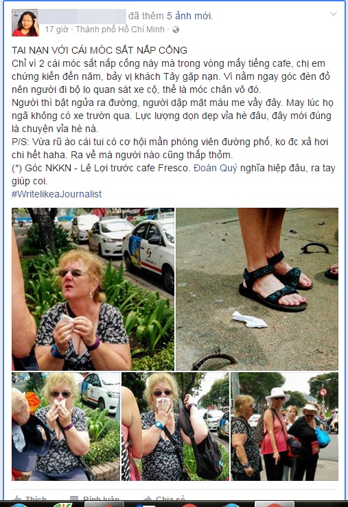 Như đã đưa tin, sáng nay (4/4) một facebooker đã chia sẻ trường hợp nữ du khách bị ngã dập mặt do vướng chân vào vòng sắt: "Chỉ vì 2 cái móc sắt nắp cống này mà trong vòng mấy tiếng cafe, chị em chứng kiến đến năm, bảy vị khách Tây gặp nạn. Vì nằm ngay góc đèn đỏ nên người đi bộ lo quan sát xe cộ, thế là móc chân vô đó.